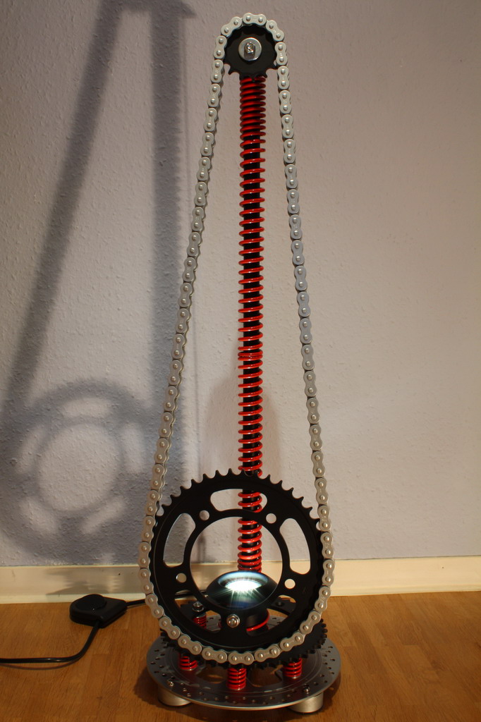 Nachdem ich in meinem Keller einige alte Mopedteile gefunden habe, kam mir die Idee, daraus eine Stehlampe zu bauen. Nach vielen Stunden der Planung und des Bauens ging ich daran, die Teile für die Lackierung vorzubereiten. Jeder, der schon Mal eine alte Motorradkette, die 40Tkm lief geputzt hat, wird mit mir mitfühlen können. Besonders wenn diese absolut fettfrei sein muss..... Verbaute Teile: Bremsscheibe, Ritzel und Kettenblatt von einer Yamaha TT 600 R Gabelfedern und Ventilferdern von einer Honda CBR 1000 F Kette und Kettenblatt von einer Honda CBR 1100 XX Gesamthöhe: 88 cm