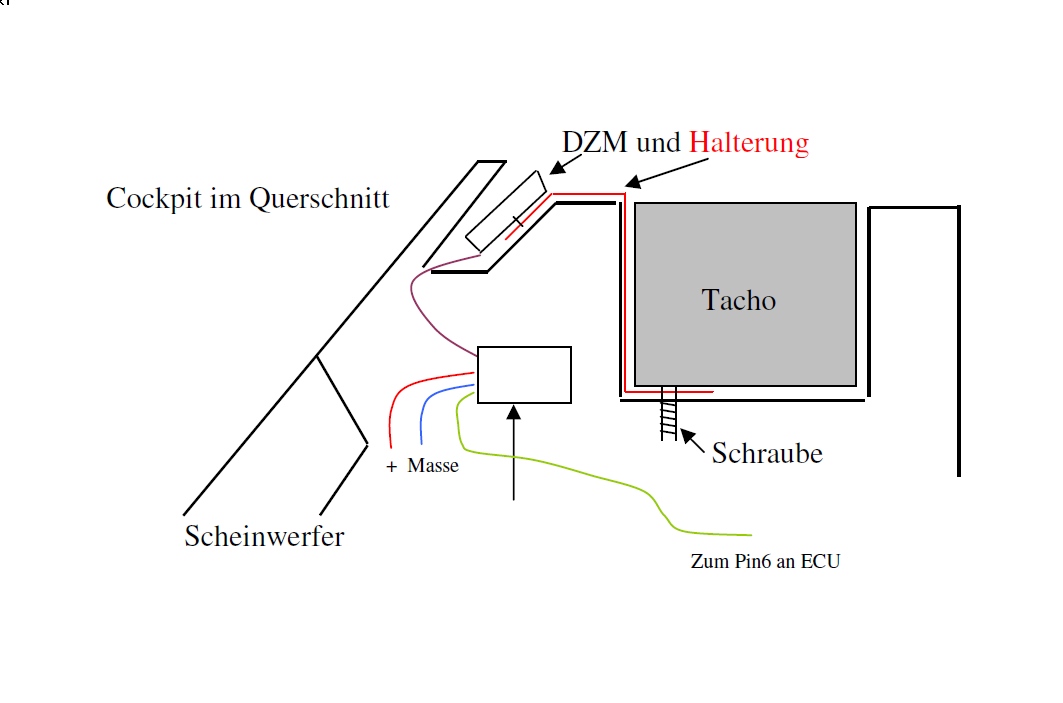 Diese Schaltung ist einfach aufgebaut, man kann die auf einer Lochrasterplatine aufbauen ohne noch Platinen ätzen zu müssen und sie ist klein genug um sie in das winzige Cockpit der KTM zu bekommen. Um Platz zu sparen, musste ich die Schaltung allerdings noch auf 2 Platinen aufteilen. Auf der ersten sind nur die Spannungsregler und die Frequenz-Spannunngs-Wandlung und auf der zweiten dann die Anzeigentreiber und LEDs. Hier habe ich mich für 30 LEDs entschieden, sodaß er eine Auflösung von 333 U/min hat. Da der DZM für alle Motoren geeignet ist, muss zum eichen nur ein Rechtecksignal mit 12V und 166HZ an den Einganz angelegt werden. Mit Hilfe des Trimmers wird dann die max. Drehzahl eingestellt. (Alle LEDs leuchten) Die drei benötigten Leitungen, die die Platinen verbinden passen gut durch das vorhandene Loch in der "Regenrinne". Das Drehzahlsignal kann direkt von Pin 6 der ECU, die sich unter dem Tank befindet, abgegriffen werden. Für die Spannungsversorgung liegen im Cockpit bereits 2 nicht verwendete Stecker mit Masse und geschaltetem Plus (ACC2). Das Gehäuse ist aus 0,3 mm Alu für die Abdeckung und 1 mm Alu für die Frontblende entstanden. Die Halterung ist so konstruiert, dass sie unter den Tacho geführt wird und mit seiner Halteschraube fixiert wird. So muss am Cockpit nicht gebohrt werden. Hier eine Skizze. Als Abdeckung der LEDs habe ich eine bedruckte Kopierfolie verwendet.